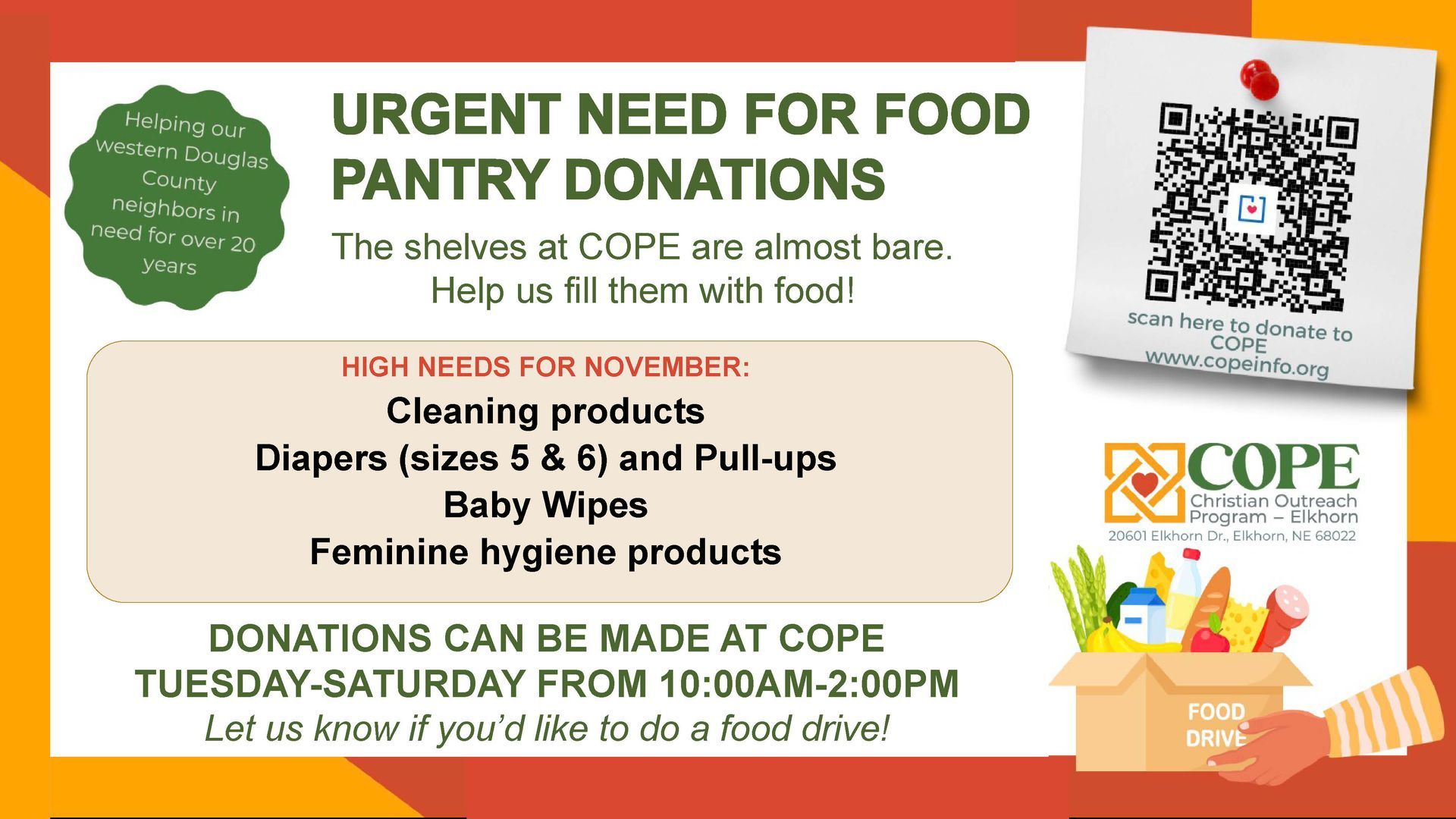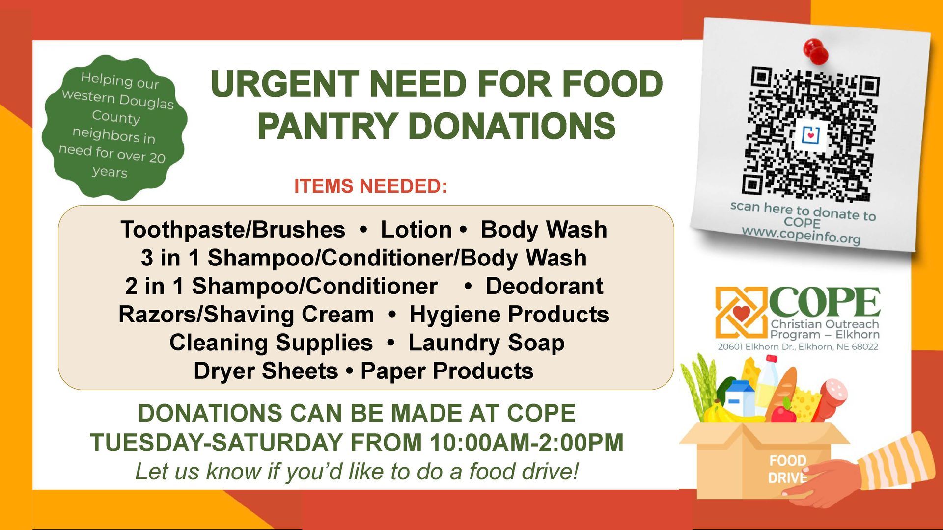The Christian Outreach Program – Elkhorn (COPE) is a multi-denominational non-profit organization made up of ten Christian churches in western Douglas County.